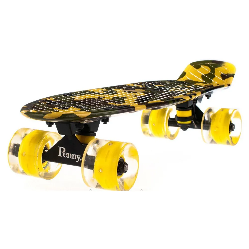 Пенни Борд с рисунком Zippy skateboards Ultra Led желтый камуфляж – это обновленная серия пенни бордов с рисунками и светящимися колесами. Благодаря своему высокому, проверенному годами качеству исполнения в каждой детали, эти пенни борды подарят максимум удобства и комфорта при катании. Принты нанесены по специальной технологии с обеих сторон доски пенни, не стирается от ног. Гибкая, надежная дека, прослужит долго, а выглядеть будет идеально даже после самых смелых трюков. Супер крепкие подшипники выдержат любые нагрузки. Учитесь крутым трюкам, на этой доске доступно все что угодно.