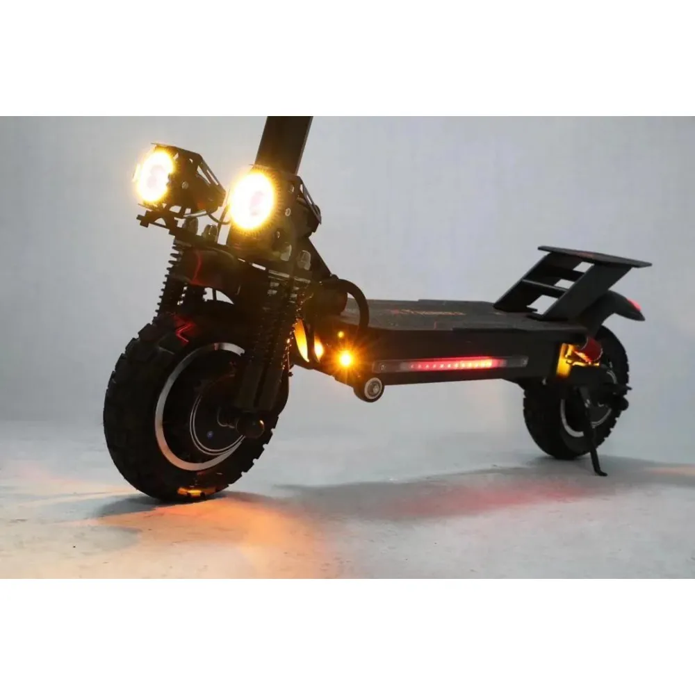 Электросамокат WS-Thunder 2400W 48V21ah - достойный представитель городского экологического транспорта. Производители оснастили данную модель производительными моторами суммарной мощностью 2400 W, которые позволяют развивать впечатляющую скорость до 50 км/час. Полный привод обеспечивает хорошую проходимость и возможность преодолевать подъемы и небольшие препятствия на пути. Во время движения по ровным городским улицам полный привод можно отключить, что уменьшит расход аккумуляторной батареи. 10-дюймовые колеса с глубоким протектором обеспечивают хорошее сцепление с дорожным покрытием, позволяя сохранять устойчивость при движении и маневрировании. Электросамокат выполнен из прочного алюминиевого сплава и выдерживает нагрузку до 155 кг, вес самого устройства при этом составляет 29 кг. Складная конструкция делает электросамокат более компактным и удобным для хранения и транспортировки. Маленькие колесики в передней части платформы позволяют катить самокат в сложенном виде, не поднимая его полностью. Система освещения включает три элемента в передней части электроскутера (основной фонарь посередине и два дополнительных по бокам), а также три габаритных огня сзади. На боковой части платформы расположена светодиодная подсветка, которая делает электроскутер более заметным в темное время суток.