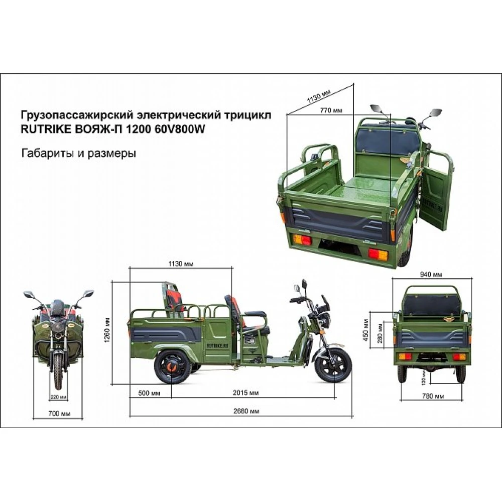 Груовой электротрицикл Rutrike Вояж-П 1200 Трансформер 60В 80 Вт  в зеленом цветовом оттенке - техника, предназначенная для лиц с активной жизненной позицией, жителей сельских районов, для которых отдых на свежем воздухе находится на первом месте. Электротрицикл грузоподъемностью до 400кг идеально подходит для вылазок с друзьями, езды на рыбалку и другие мероприятия на природе.