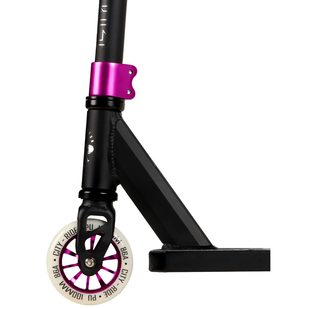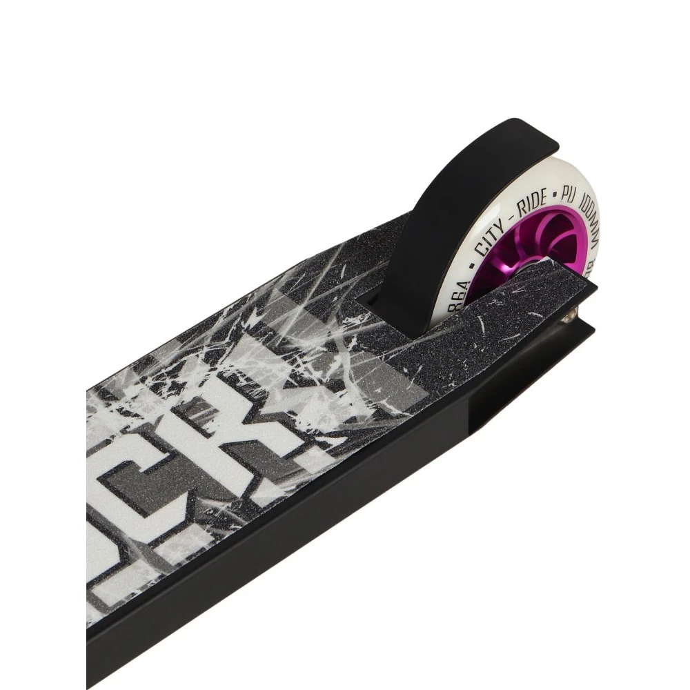 Стальная рулевая стойка высотой 560 мм беспрекословно слушается пользователя. Нескользящая дека с брендовой шкуркой исключает случайное соскальзывание ног и падение. Прорезиненные грипсы удлиненной формы не провоцируют запотевание рук и другие непредвиденные действия, увеличивают степень безопасности. Максимальный разгон обеспечен благодаря оснащенности тс 100 мм колесами и инновационными подшипниками.